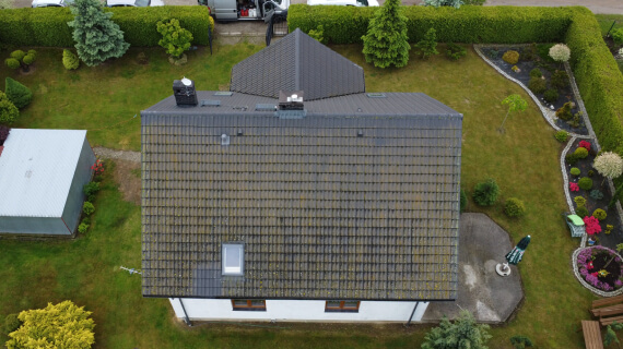 In Bolesławice haben wir eine umfassende Dachsanierung durchgeführt, die eine gründliche Reinigung sowie eine zweifache Beschichtung in der eleganten Farbe Blauschwarz umfasste. Die Arbeiten begannen mit der sorgfältigen Reinigung der Dachziegel von Schmutz, Flechten und Moosen, die mit der Zeit die Struktur der Dachdeckung beeinträchtigen und das Erscheinungsbild des Gebäudes negativ beeinflussen können.