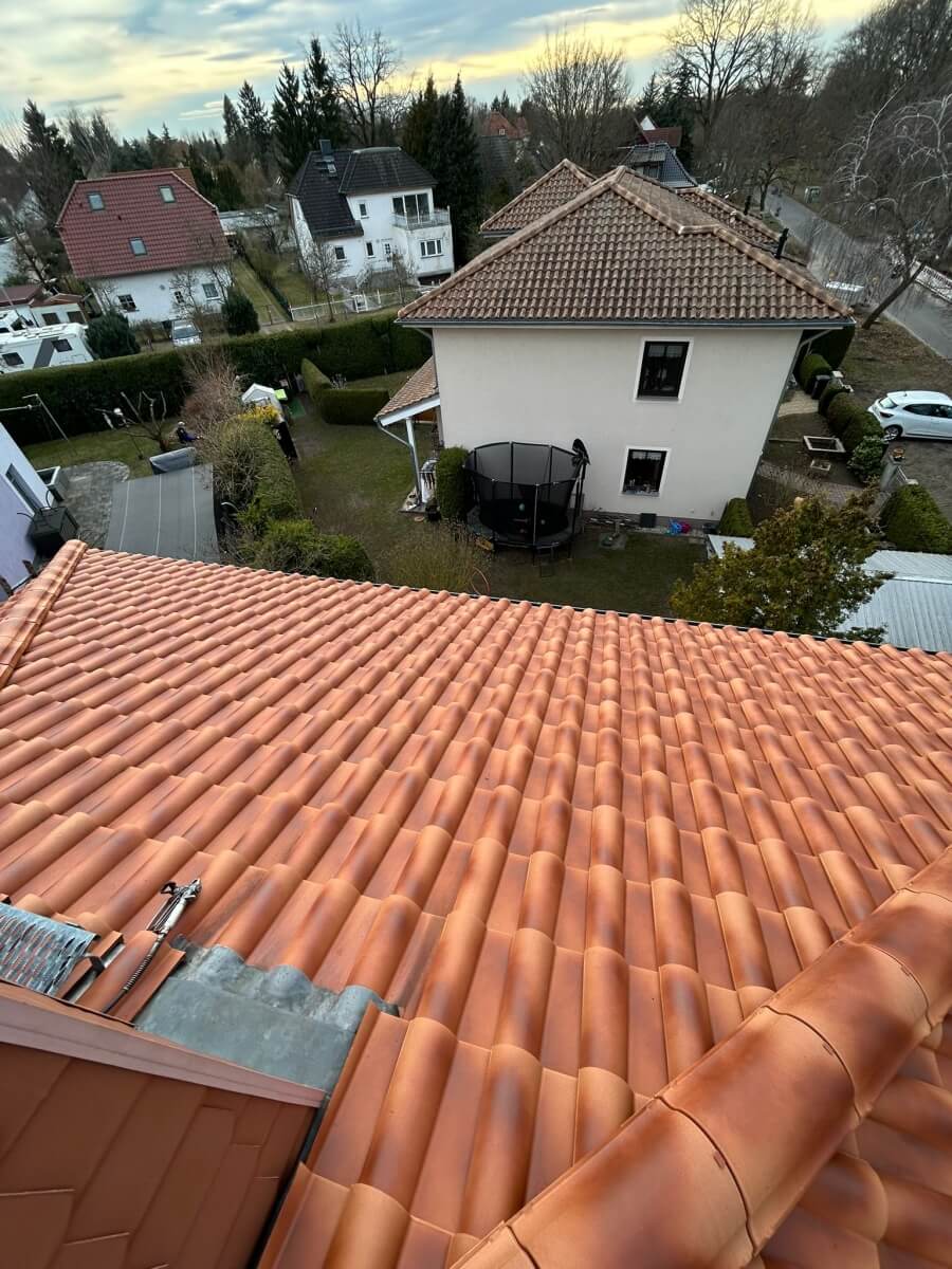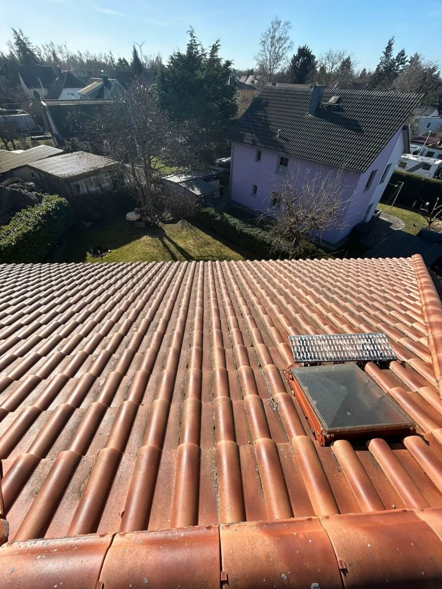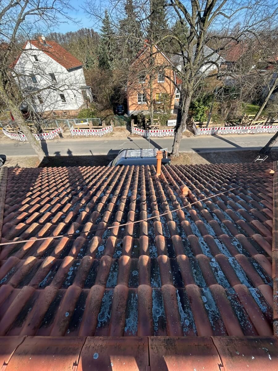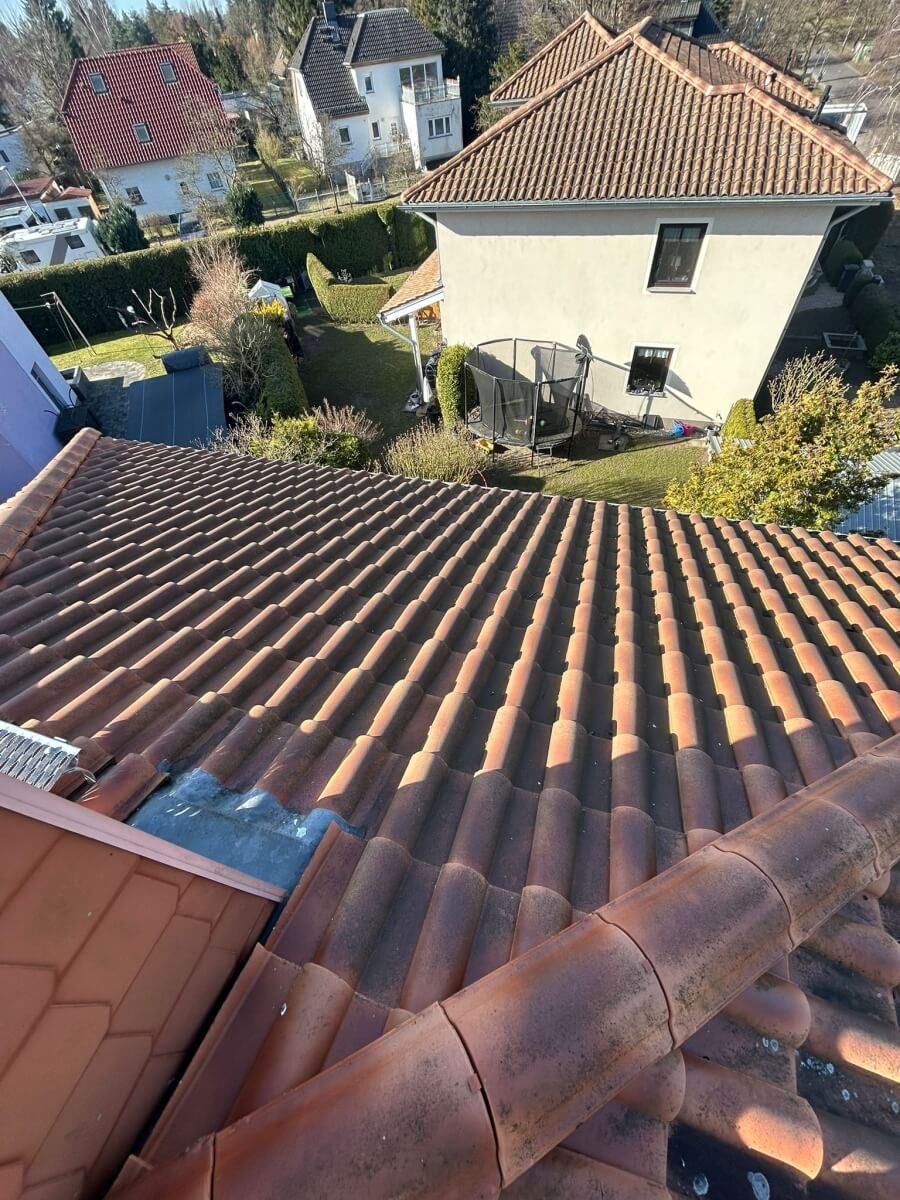 In Berlin hat ein weiterer Kunde unsere 1.500-Euro-Aktion genutzt und konnte bereits nach nur einem Arbeitstag einen deutlich sichtbaren Unterschied an seinem Dach erkennen. Vor Beginn der Arbeiten war die Dachfläche verschmutzt, teilweise nachgedunkelt und von Ablagerungen geprägt, sodass die ursprüngliche Farbwirkung der Dachziegel kaum noch zur Geltung kam. Insgesamt wirkte das Dach gealtert und brauchte eine professionelle Aufbereitung.