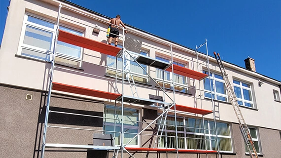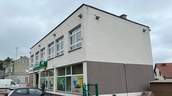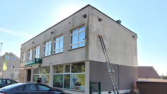 Fassadenanstrich des Gebäudes der Genossenschaftsbank – Iłowa Fassadenreinigung & Fassaden streichen Vorher / Nachher Vergleich